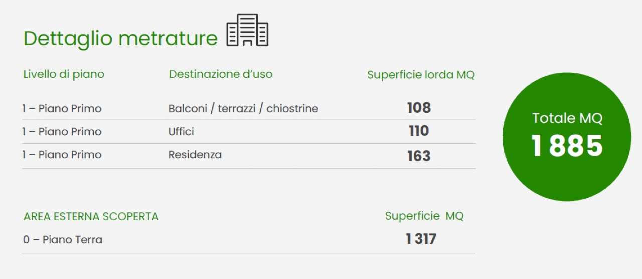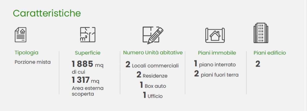 L'immobile in oggetto è costituito al piano interrato da depositi/archivi e box auto; al piano terra da due locali commerciali, locali tecnici, servizi igienici ed ampia area esterna scoperta; al piano primo da due appartamenti ed un ufficio, tutti serviti da terrazzo.